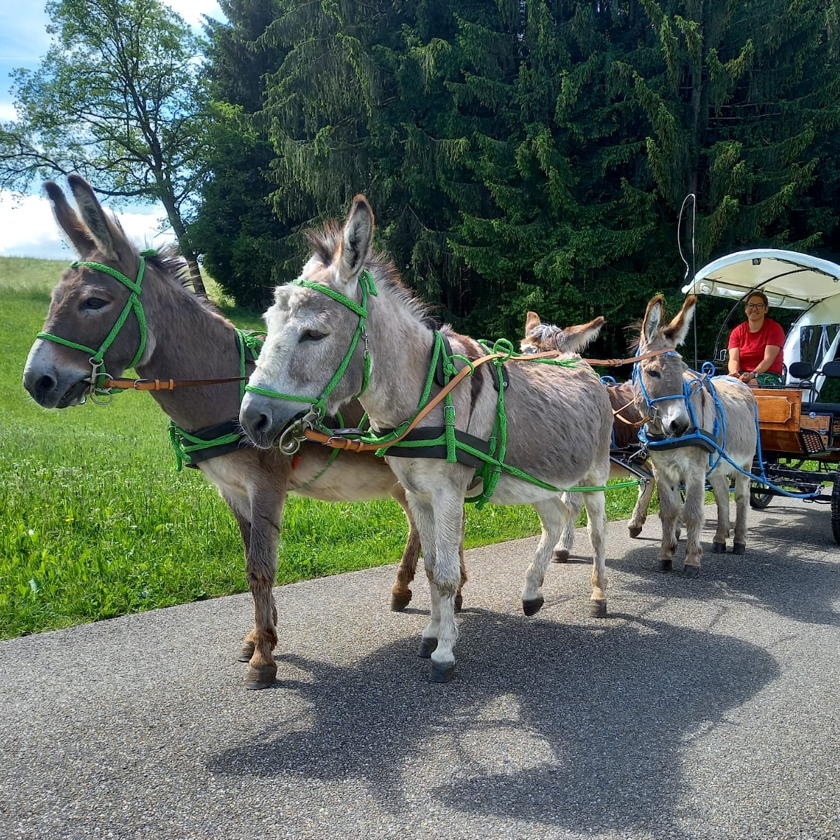 Die wohl gängigste und am einfachsten zu fahrende Art des Anspannens ist das zweispännige Fahren. Dabei laufen die Tiere sozusagen im Team und finden bei Ungewohntem Rückhalt bei ihrem Nachbarn. Eine weitere Möglichkeit zwei Esel vorzuspannen ist das Tandem. Hier laufen die Esel voreinander. Probieren Sie es einfach aus und lassen Sie sich von unseren beiden Wallachen Gustl und Kasper durch die wunderschöne allgäuer Landschaft kutschieren.